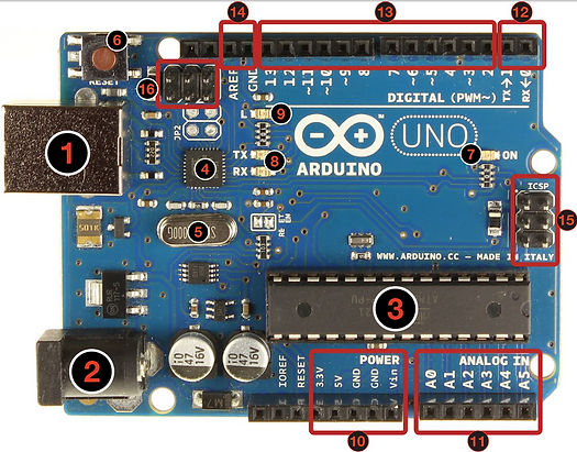 La placa Arduino Uno está basada en el micro controlador ATmega328, tiene pueden ser usados como salidas de PWM (Pulse Width Modulation, en castellano Modulación por Ancho de Pulso), 6 entradas analógicas, un resonador cerámico de 16MHz, una entrada de corriente con conexión jack y un botón de reinicio.